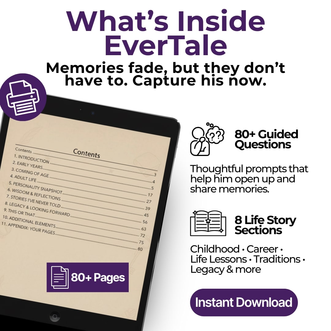 Got the EverTale PDF for my dad’s birthday. He’s not a writer, but the prompts made it easy. Now he’s typing out memories every night and emailing them to me bit by bit. It’s become our new favorite thing.